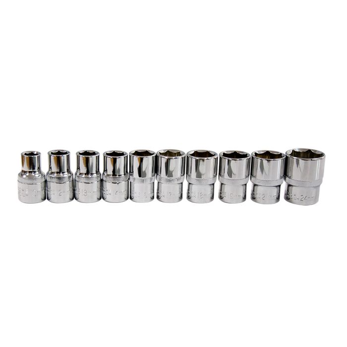 • 10 x 1/2” Square Drive Sockets: 10, 12, 13, 14, 16, 17, 18, 19, 21, 24mm