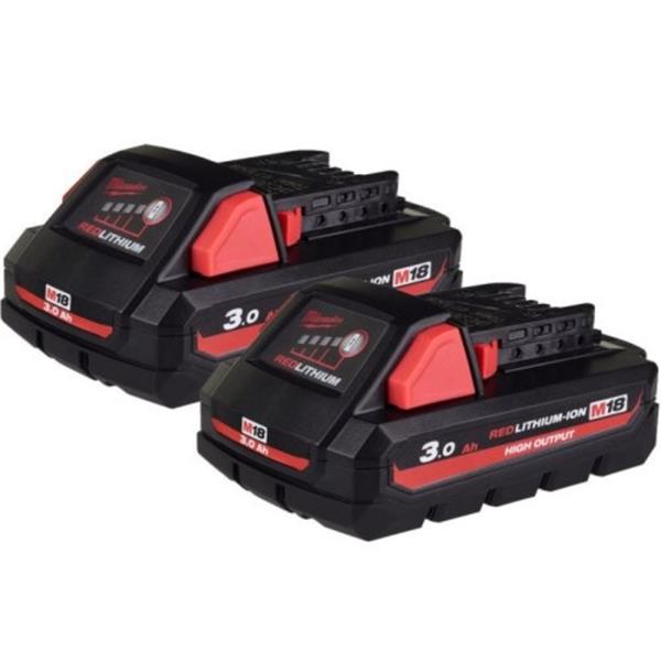 The Milwaukee 18V M18 2×3.0Ah RED LI-ION HIGH OUTPUT Battery/Charger Kit 4933471072 is an ideal kit for all trade professionals as well as DIYers. The battery packs provides up to 50% more power when compared against an M18 REDLITHIUM-ION battery pack. The Charger charges 2.0Ah, 4.0Ah, 5.0ah, 6.0Ah and 9.0Ah battery packs and can charge an M12 and M18 at the same time. This kit includes two 3.0Ah Batteries and a charger.