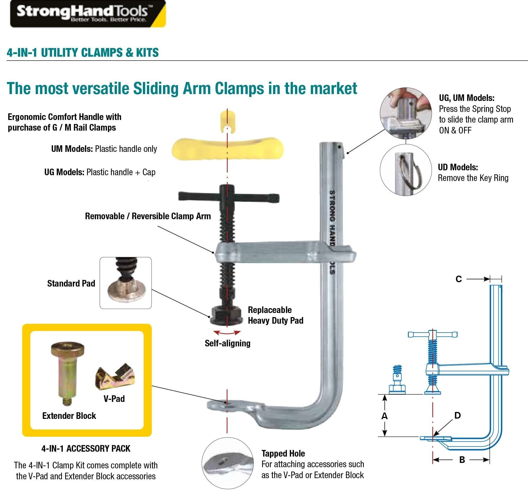 4-in-1 Welding clamp from Strong Hand Tools. These strong versatile 4 in 1 clamps are ideal for clamping standard clamping, pipe clamping with the V pad, reversed arm for spreading and step-over clamping with the extender block.