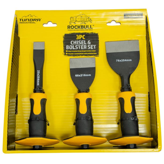 • Set Includes: 25 x 254mm Flat Cold Chisel, 60 x 216mm Electrician’s Chisel, 75 x 254mm Brick Bolster